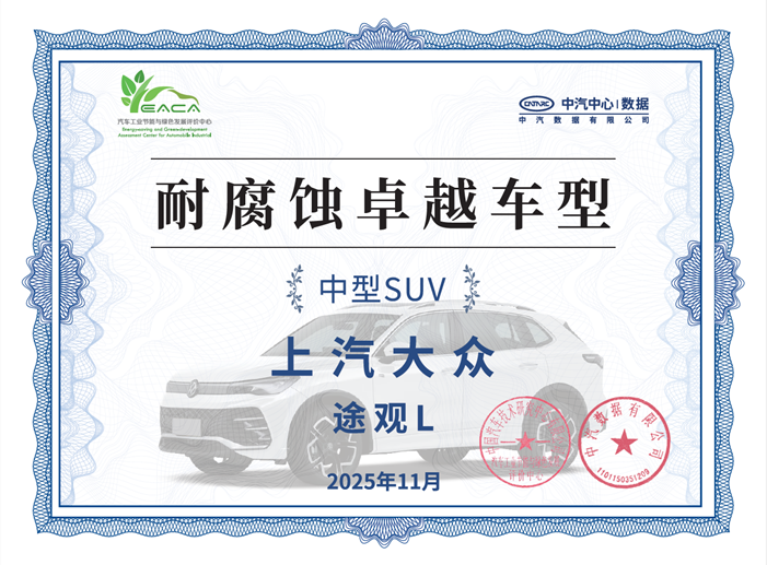 在中汽数据发布的《2025年中国汽车耐蚀质量研究成果》中,评审基于重点零部件、车身区域及整车质量三大维度,对20余款车型进行多维考评。大众途观L从中脱颖而出,凭借其卓越的防腐性能,赢得“2025年耐腐蚀卓越车型”称号。